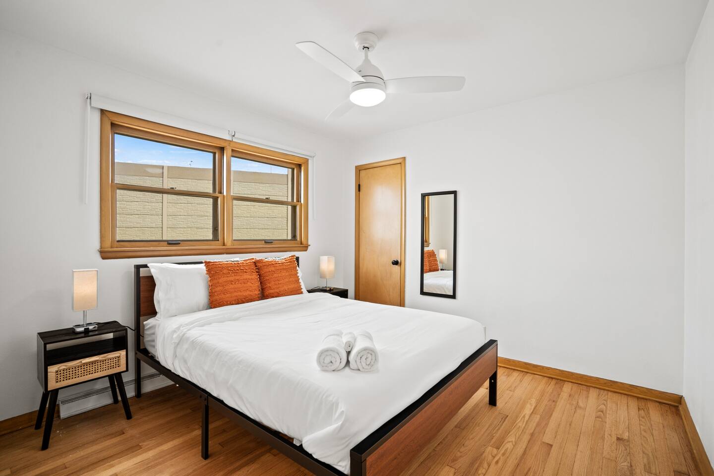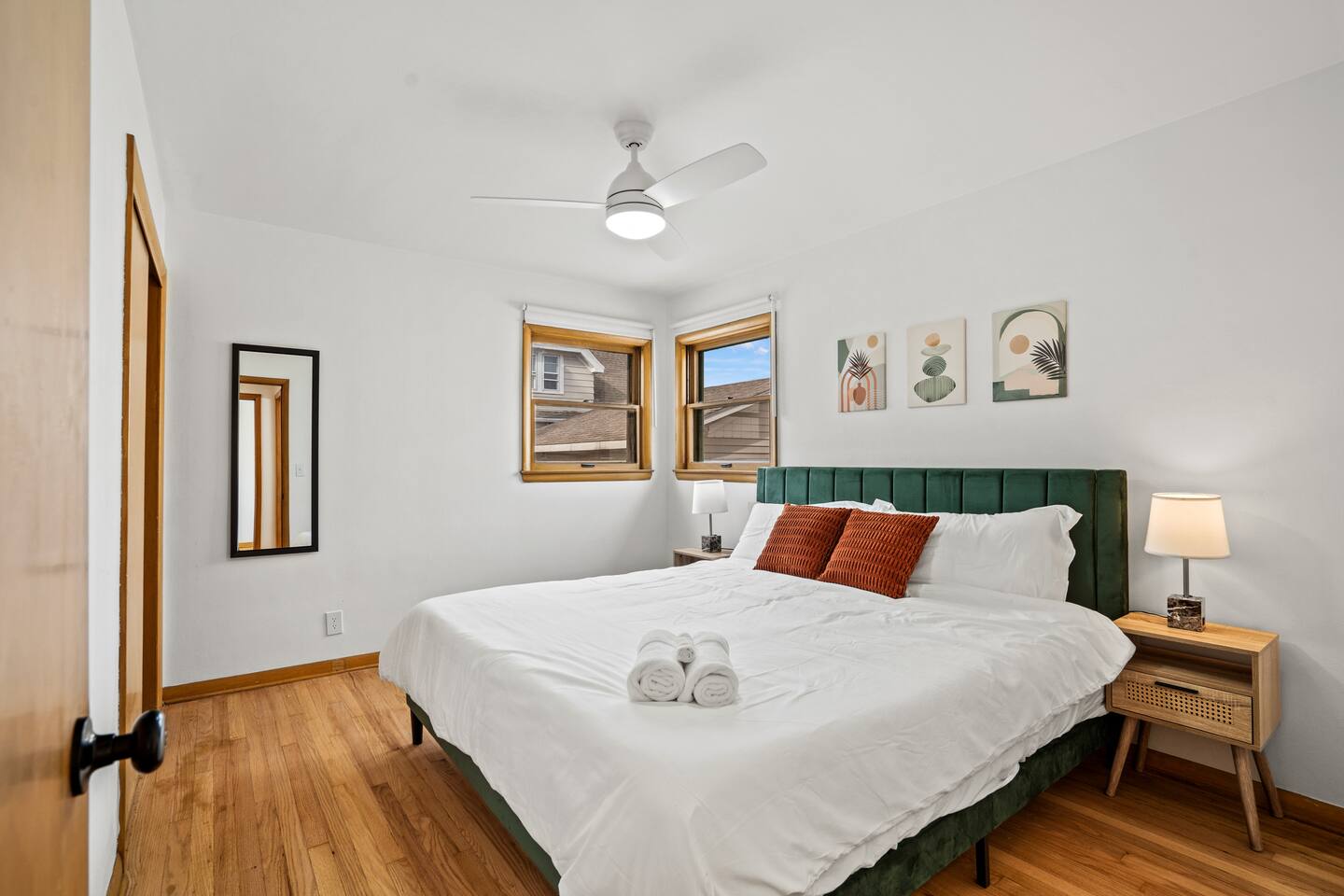Our duplex consists of two distinct, self-contained units. This is an ideal solution for those looking for a comfortable, extended stay with more space and privacy than a traditional hotel. Your unit will be on the first floor with separate entrance. Bedrooms: Two spacious bedrooms, both with ample storage and comfortable bedding. Bed Arrangement: One King-size bed in the master bedroom and another one with a queen-size bed, for a restful night's sleep. Living Room: A cozy living area with a sofa and entertainment options for relaxing after a long day. Kitchen: A fully equipped kitchen with modern appliances, cookware, and utensils for your culinary adventures. Bathroom: A clean and well-maintained bathroom with a shower and essentials provided. Work-Friendly: A dedicated workspace with a desk and ergonomic chair for remote work or study. High-Speed Wi-Fi: Stay connected with our reliable high-speed internet connection. Laundry: On-site shared laundry facilities for your convenience.